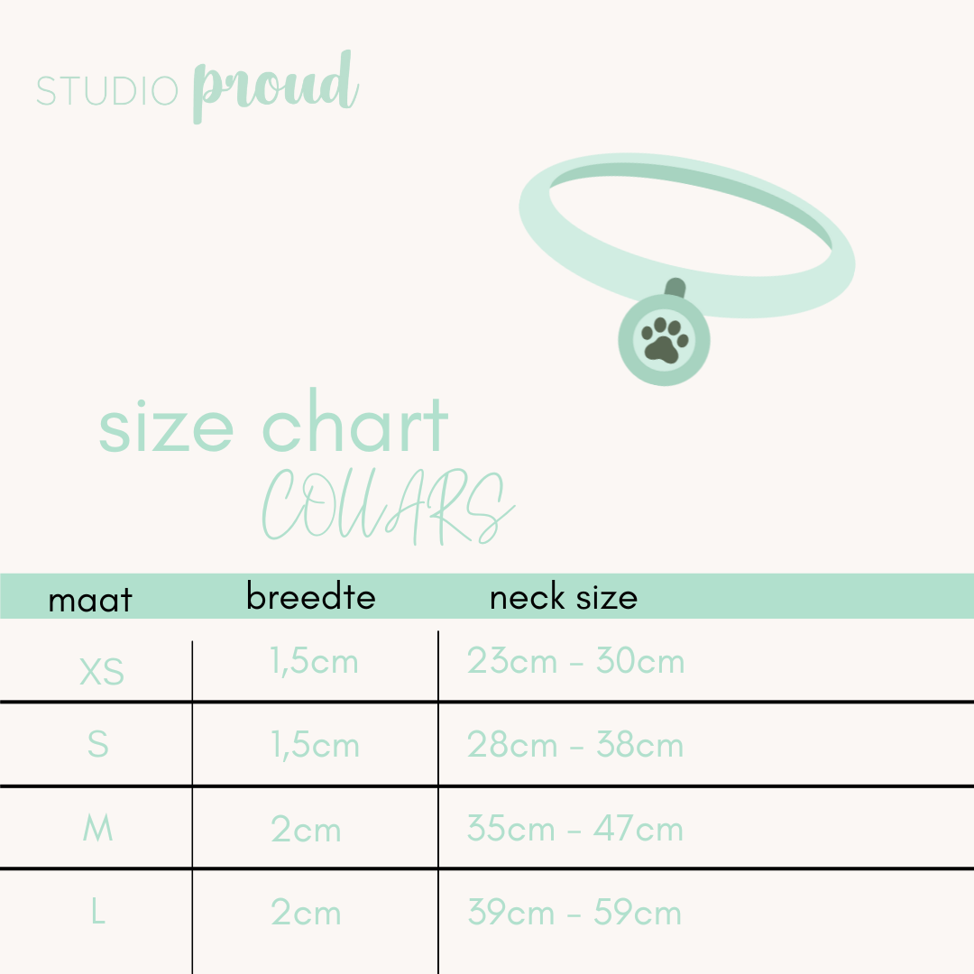 De beige hondenhalsband is verkrijgbaar in de maten XS, S, M en L, waardoor er voor zowel kleine als grotere honden een passende maat beschikbaar is.